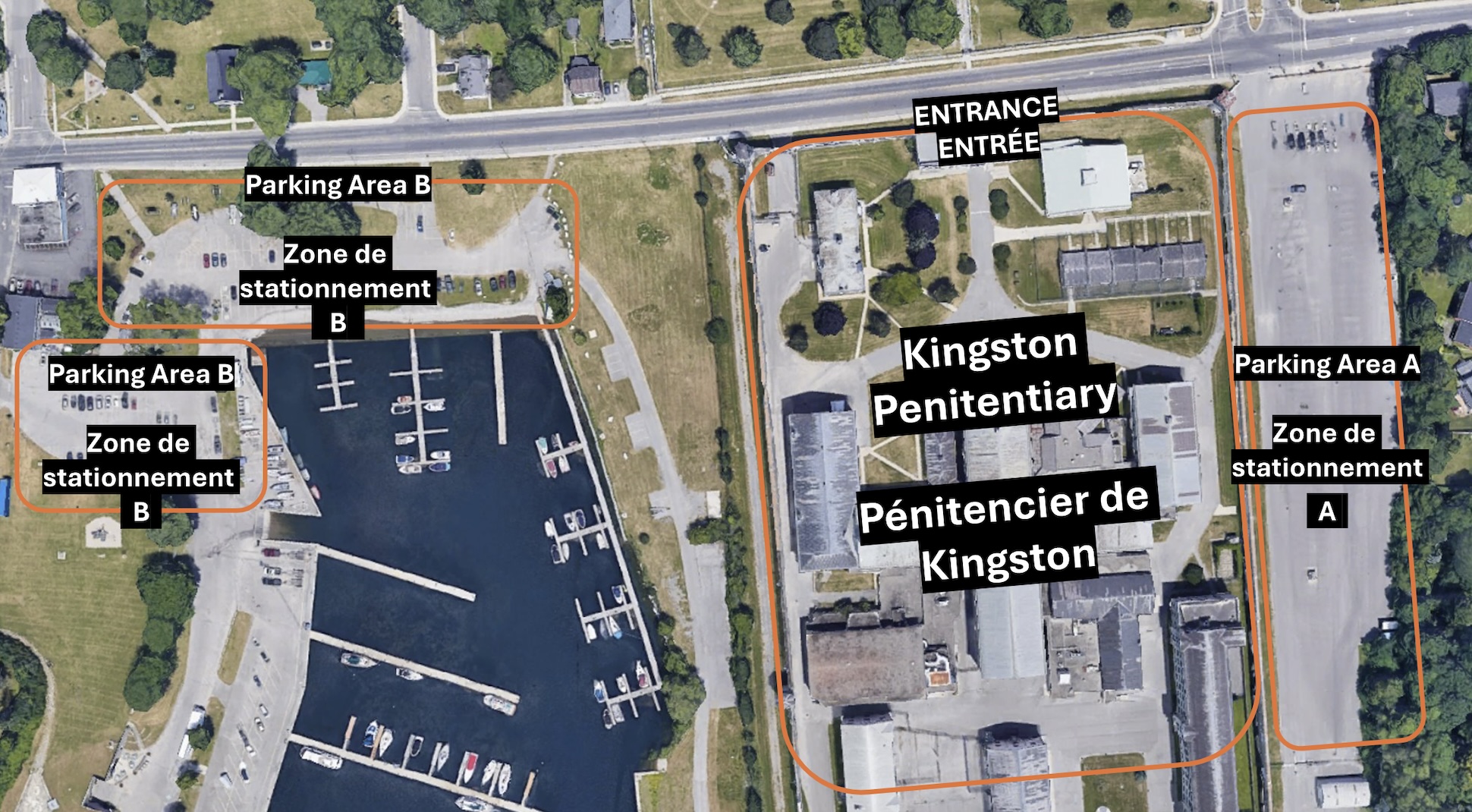 Veuillez noter que plusieurs options de stationnement gratuites sont disponibles. Le stationnement principal, situé juste à l’est du pénitencier de Kingston (aire de stationnement A), est accessible ainsi que le stationnement au port olympique de Portsmouth (aire de stationnement B). Veuillez consulter la carte ci-dessous.